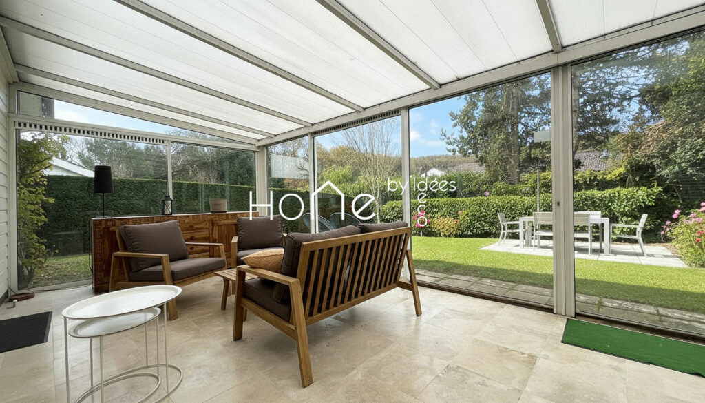 Elle dispose également d’une autre salle de bains avec wc, de fenêtres double vitrage équipées de volets roulants électriques, assurant confort et efficacité énergétique. A noter également qu’elle est équipée d’une véranda de 30 m2 environ.