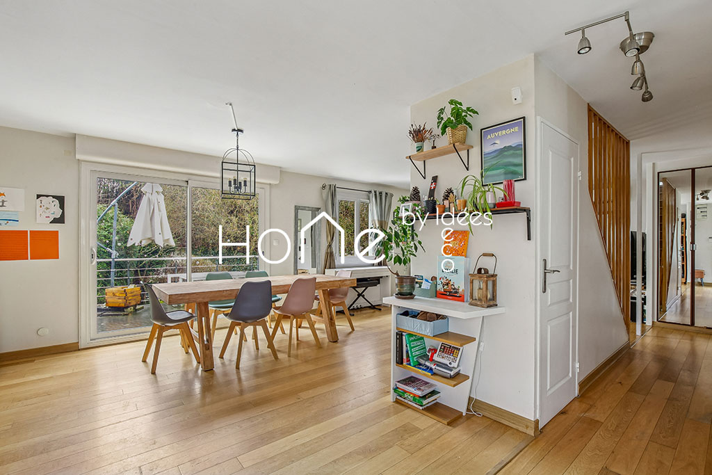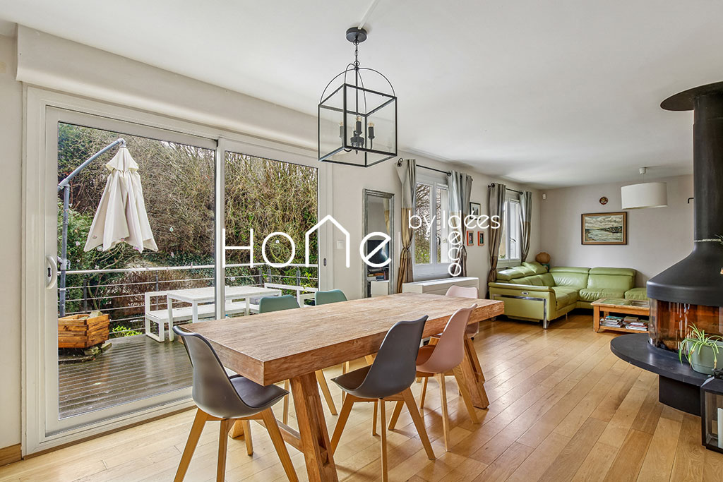 Au rez-de-chaussée : grand séjour avec cheminée, salle à manger ouverte sur cuisine rénovée, accès terrasse, 1 chambre de 12 m², salle de bain et WC.