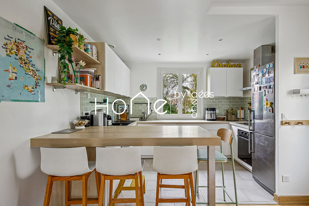 Maison rénovée en 2021 : isolation des combles, cuisine ouverte, pompes à chaleur air/air réversibles.